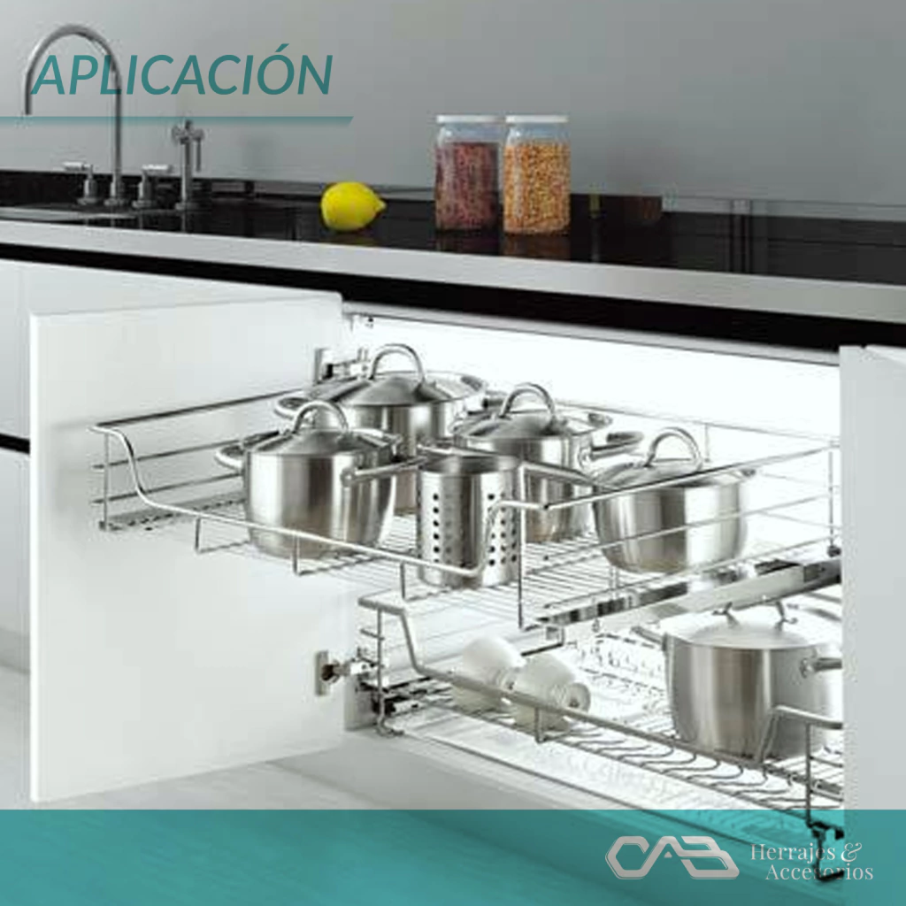 Este sistema de almacenamiento de HAFELE, modelo 540.32.230 - 31 - 32 - 33, está diseñado en acero cromado con guías de extracción total a bolillas, lo que garantiza un funcionamiento suave y eficiente. Con un peso máximo de 25 kg, es ideal para organizar diferentes espacios.