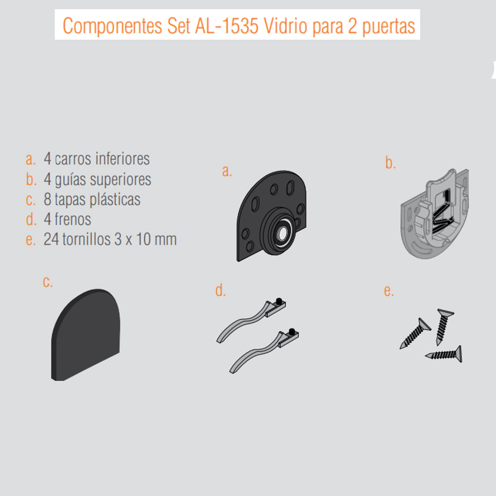 Soporte diseñado para puertas de vidrio que soporta hasta 15 kg por puerta. Compatible con vidrios de 4 a 6 mm de espesor. Para instalación, se requiere un fresado en el vidrio de 40 mm de diámetro y mecanizado para los rieles.