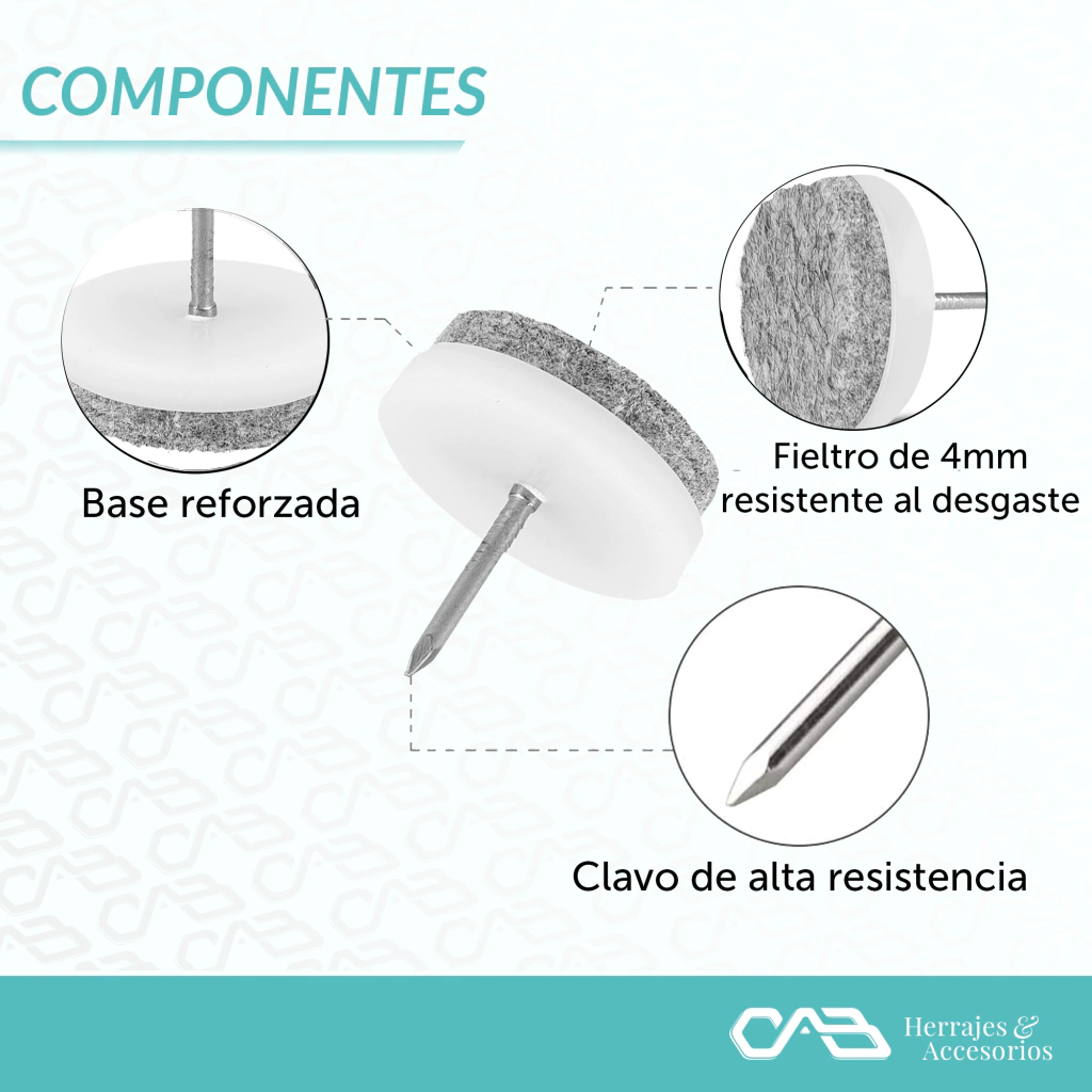 Se pueden instalar fácilmente con un martillo en la parte inferior de las sillas sillones mesas u otros muebles Para pisos: madera azulejos vinilo y alfombras de pelo bajo